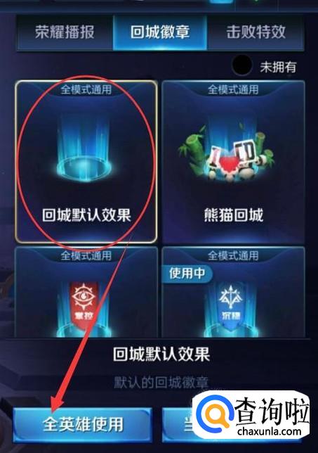 进入之后,在回城特效设置界面,选中默认回城效果,点击“全英雄使用”即可将回城特效去除。