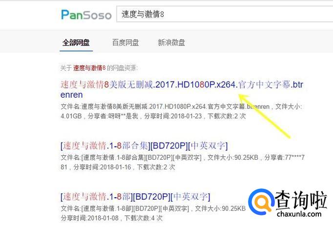 例如搜索 速度与激情8 ,就可以看到有大量的相关资源被搜索出来了,我们点击第一个