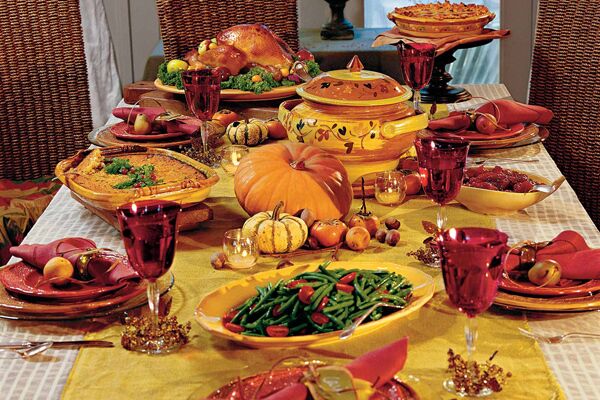 感恩节餐桌的布置也很有特色。主妇们不是照往常一样摆放鲜花,而是摆放水果和蔬菜。中间还常常放上一个大南瓜,周围堆放些苹果、桔子、栗子、胡桃、葡萄干布丁、碎肉馅饼、果汁、玉米和南瓜馅饼。有时人们还把苹果或南瓜掏空,中间放满去壳的干果或者点燃蜡烛。