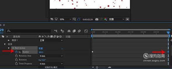 接着移动到终点的位置,将“scatter”数值设置为最大,当然你也可以自行调整,然后打上关键帧。