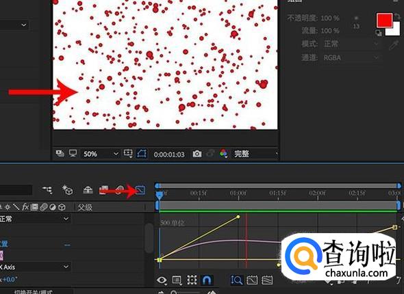 在形状图层中找到效果,然后将“scatter”选项数值设置为0,在起点位置打上关键帧。