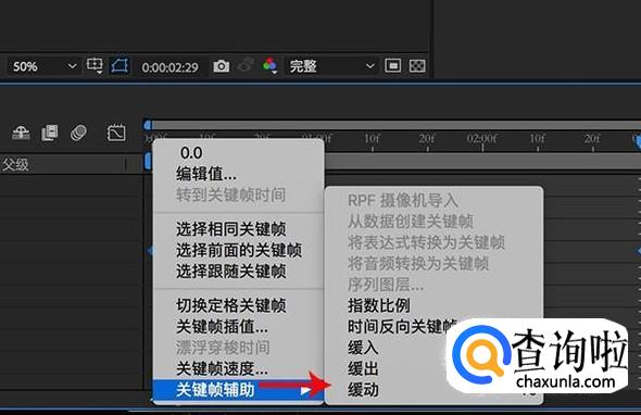 之后框选两个关键帧,右键点击关键帧,选择“关键帧辅助-缓动”