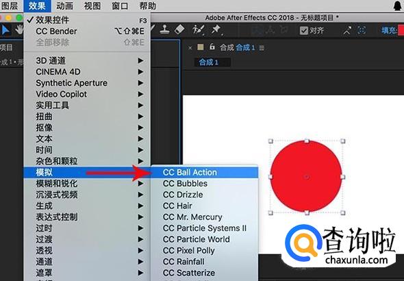 接着点选形状图层,在上方菜单中选择“效果-模拟-CC BALL ACTION”
