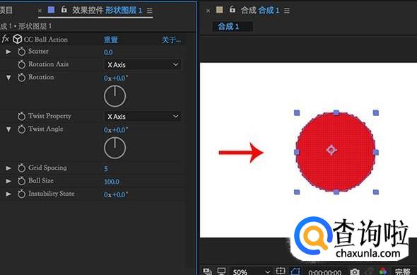添加cc ball action之后,我们能够看到形状发生了变化,左侧效果空间中就是我们需要调整的数值。