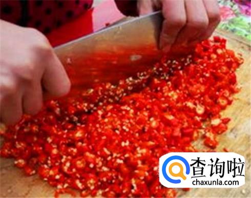 红辣椒去蒂,种子不用去掉的,直接用刀剁成细末,剁辣椒的时候带上胶皮手套吧,不然遭罪的可就是你了。