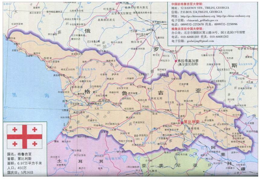 格鲁吉亚(西亚国家)北接俄罗斯,西南与土耳其接壤,东南和南部分别与阿塞拜疆和亚美尼亚相邻,978年建立格鲁吉亚王国,19世纪初遭俄罗斯帝国吞并,1991年4月9日,正式宣布独立。