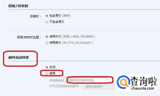 往下划动页面,可以看到“邮件自动转发”,如图所示,我们只要选择“启用”该功能,然后设置“自动转发到”,填上自己常用的其他邮箱,就可以了。