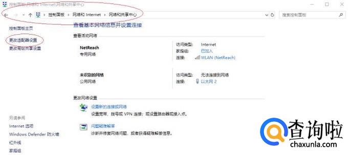唤出"网络和共享中心"选项,如图所示。点击左侧"更改适配器设置"图标,下步将进行正确使用设置无线网卡的操作。
