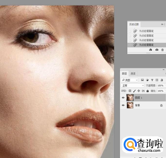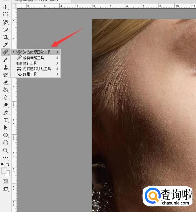 将明显的斑痕去除以后,选择工具栏中的污点修复画笔,对小范围的杂色进去涂抹修复