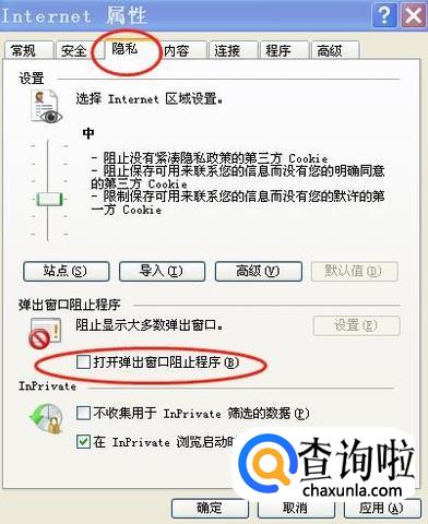 再打开“internet选项”,点击上方的“隐私”按钮,在弹出的菜单中,取消勾选“打开弹出窗口阻止程序”,然后点击“确认”按钮。
