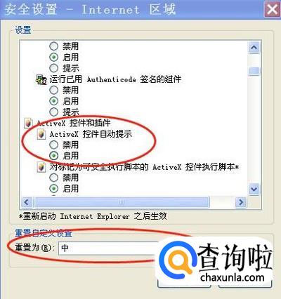 在弹出的“点击自定义级别”窗口中,把含有“ActiveX”字样的选项都改为启用,再把“重置自定义设置”改为“中”,然后点击“确定”。