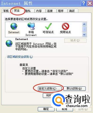 在弹出的“internet属性”窗口中,点击上方的“安全”按钮,在弹出的窗口中点击“自定义级别”按钮。