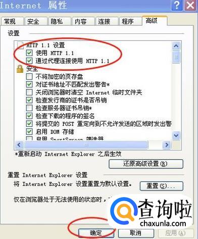 再点击“internet选项”,点击“高级”按钮,勾选HTTP1.1,SSL2.0.SSL3.0,TLS1.0,点击“确认”就可以了。