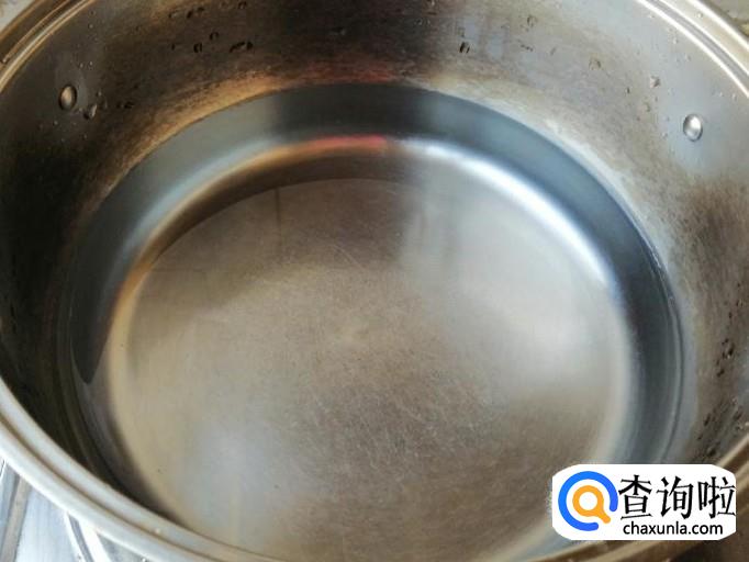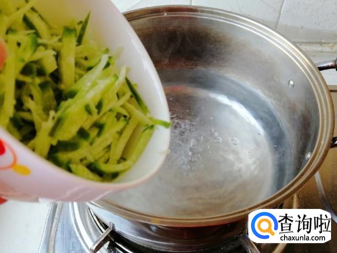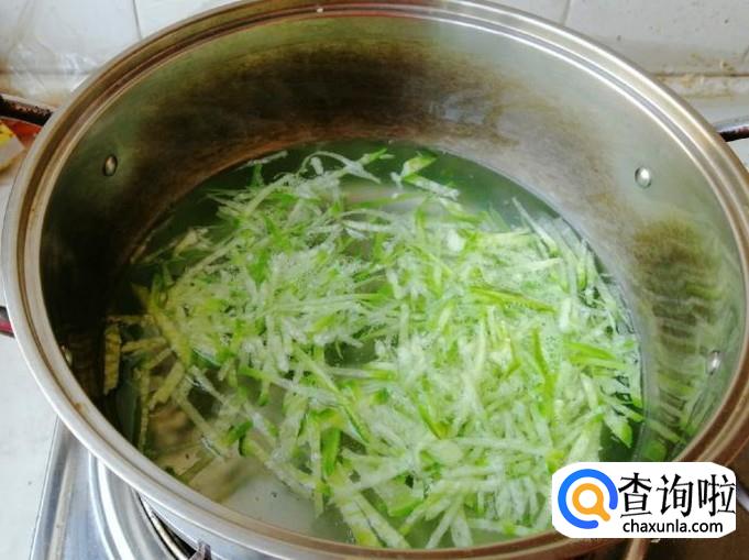煮锅放入适量水,开火烧水,水开后先放入备好的萝卜丝,因为萝卜丝比芹菜叶子熟的慢,所以先放萝卜丝煮开。