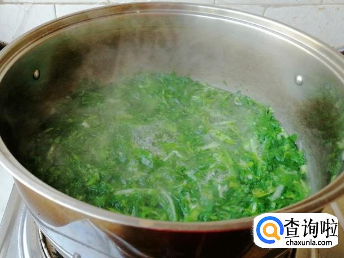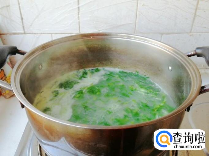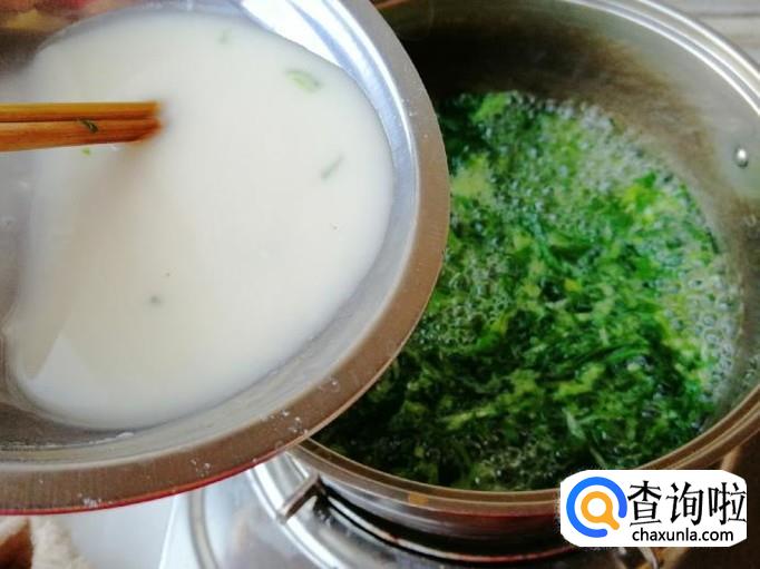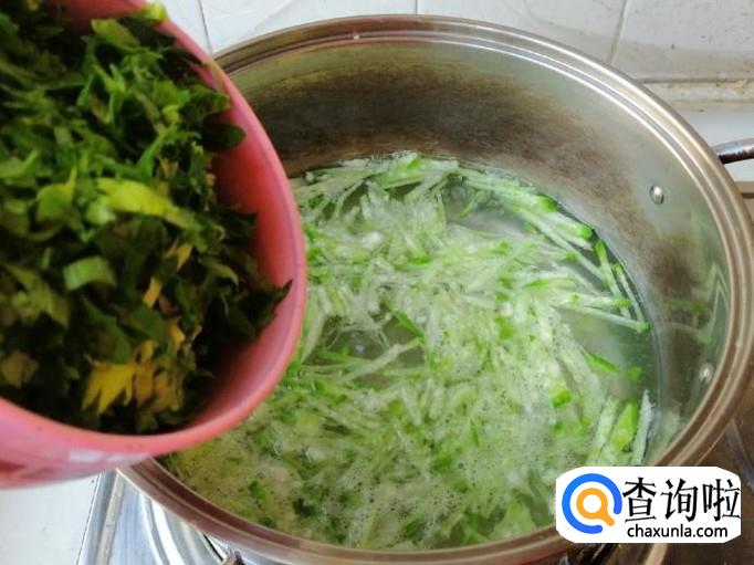 大约煮一两分钟后,放入切好的芹菜叶子,再次煮开,等萝卜丝和芹菜叶子都差不多熟了再加面糊。
