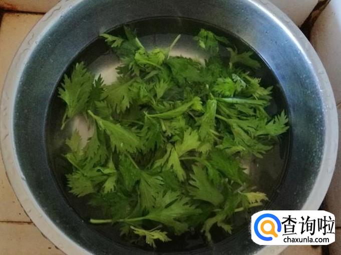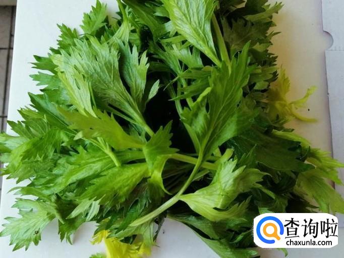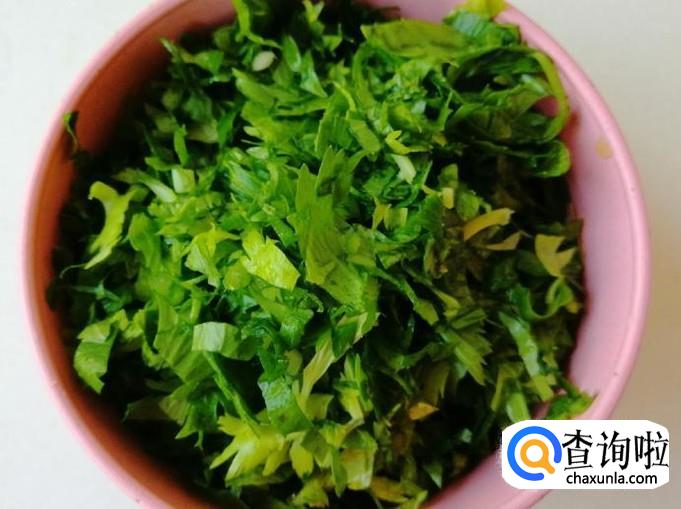挑选鲜嫩的芹菜叶子,放入洗菜盆中用清水洗净,最好是用盐水把芹菜叶子泡一会儿,防止叶子上有农药残留,洗净切碎待用。
