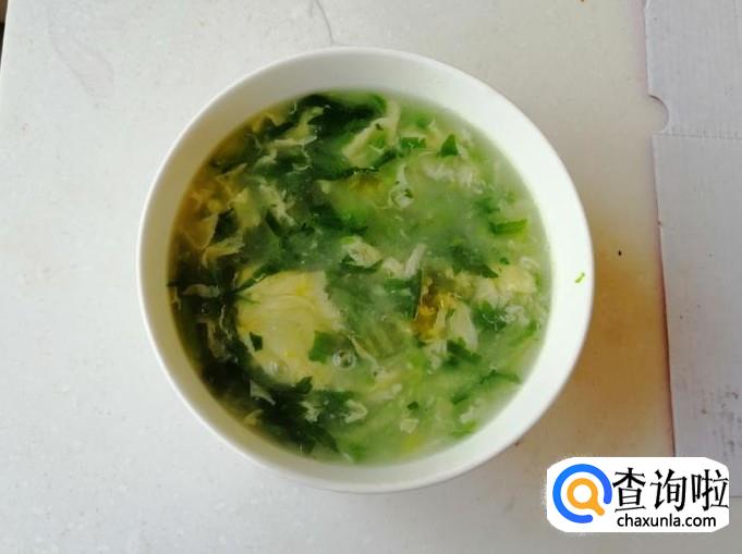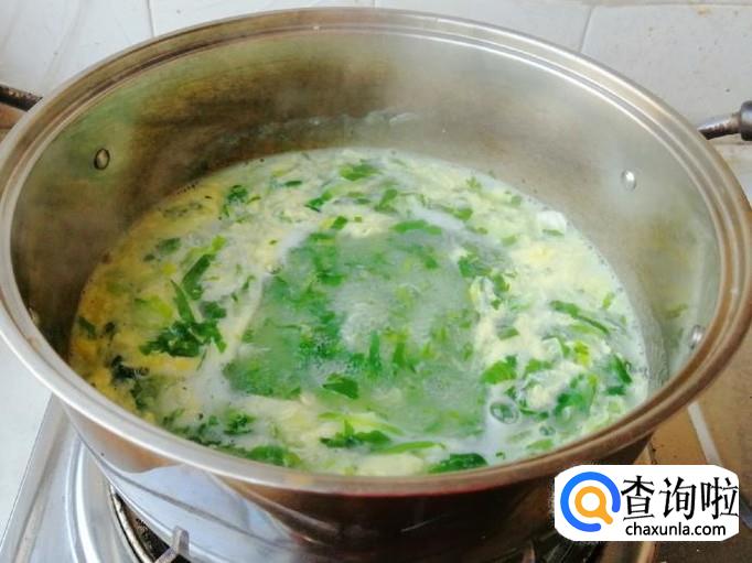 如图所示蛋液完全浮在汤上了,这时就可以关火,加入适量盐和香油,这样我们的芹菜叶子萝卜鸡蛋汤就做好了,有点淡盐味,清香可口营养丰富。