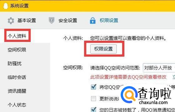 接着再点击个人资料中的权限设置。