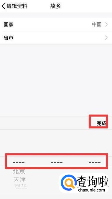 然后把地址往下滑,全部选择四条横线,然后点击完成,这样QQ故乡就会被隐藏了。