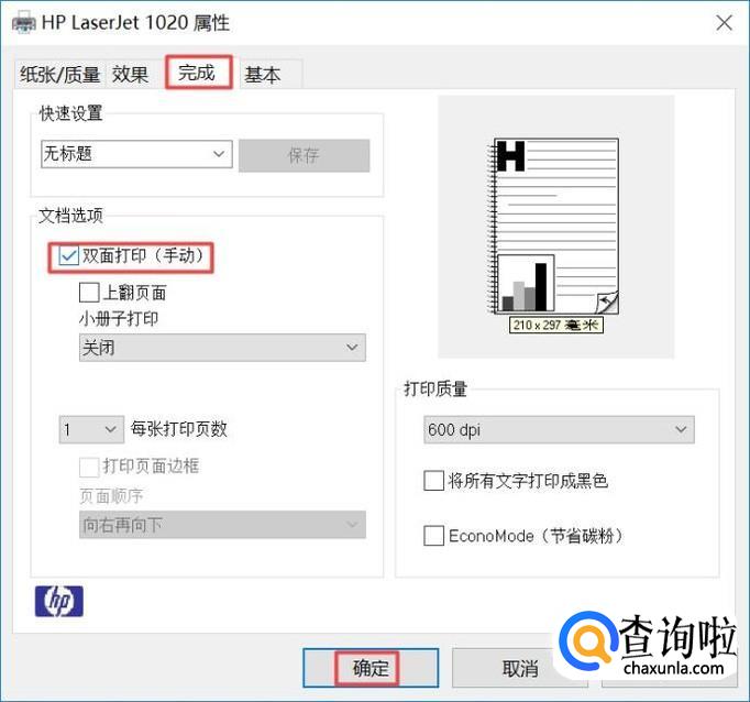 弹出的界面,我们点击完成,然后我们将双面打印给勾选上,之后我们确定按钮;