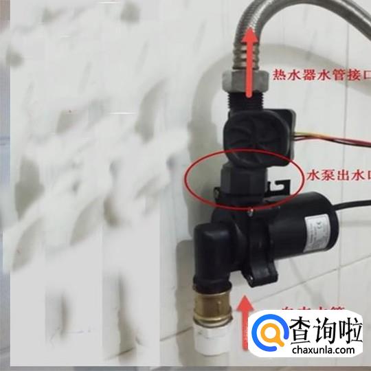 将水泵的出水口接入太阳能热水器水管,热水器的水管大小不能小于水泵出水口直径,过小会造成水泵憋压,进而造成水泵负载过重,烧坏电机。
