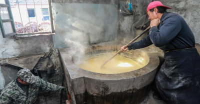 农村习俗,每年的农历腊月二十三,祭灶神的日子,取成块的麦芽糖放置于铁锅中,加热使之变软,掺入芝麻粒,用擀面杖制作成约3mm厚的薄片,用刀分隔,待温度退却后食用,味道香醇,酥而不腻。