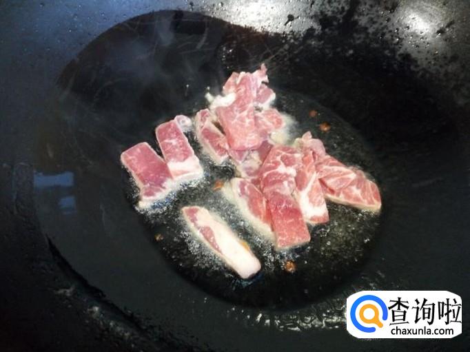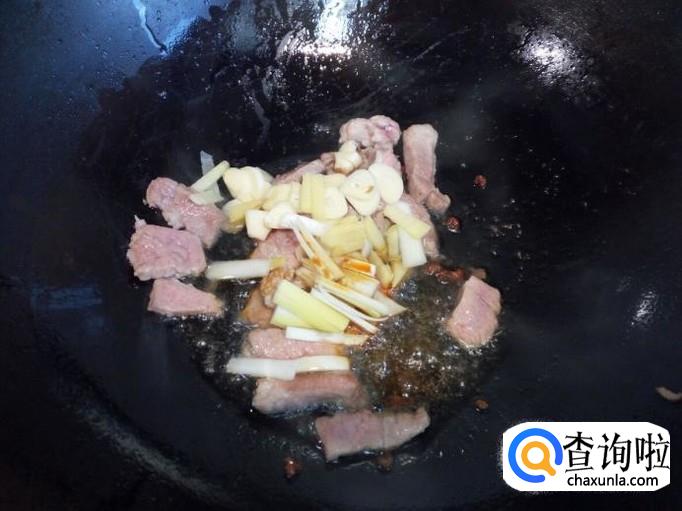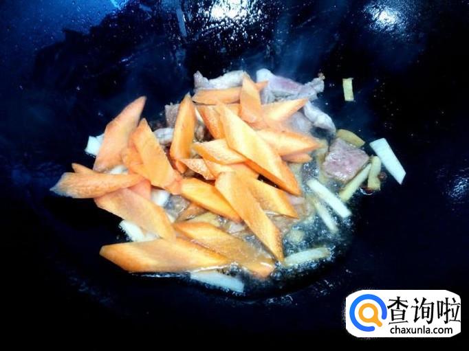 炒至肉片颜色微白,放入葱,姜,蒜翻炒,放入少许酱油。然后放入胡萝卜翻炒。