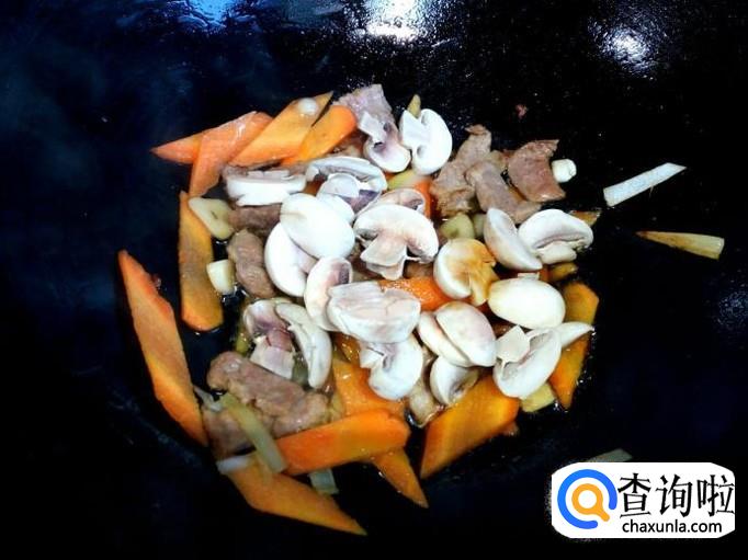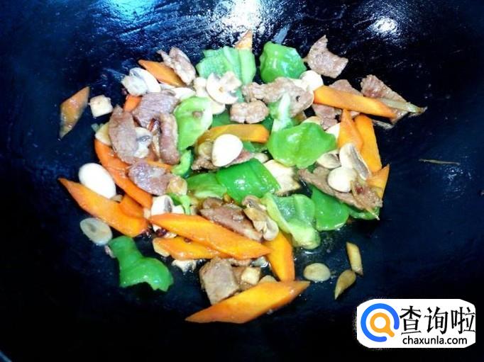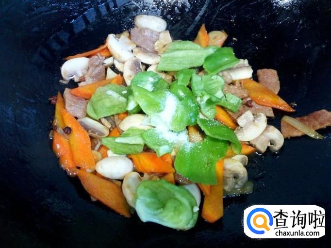 炒至胡萝卜变软,放入口蘑翻炒,放入料酒,一小匙儿蚝油。口蘑略翻炒一下,放入青椒翻炒,放入盐。