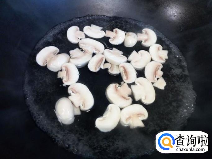 口蘑用水焯一下,水开后入锅10秒钟捞出,沥干水分。