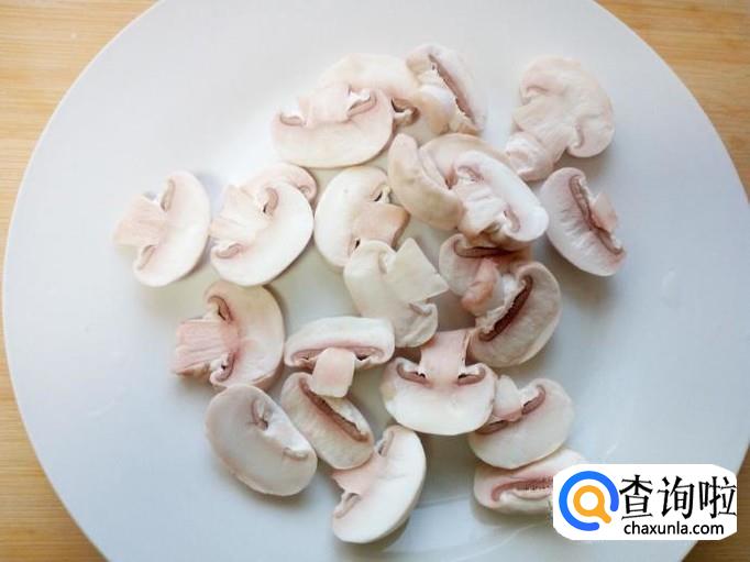 口蘑用水清洗干净,控干水分,切成片。