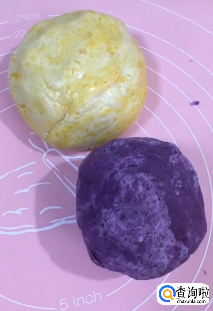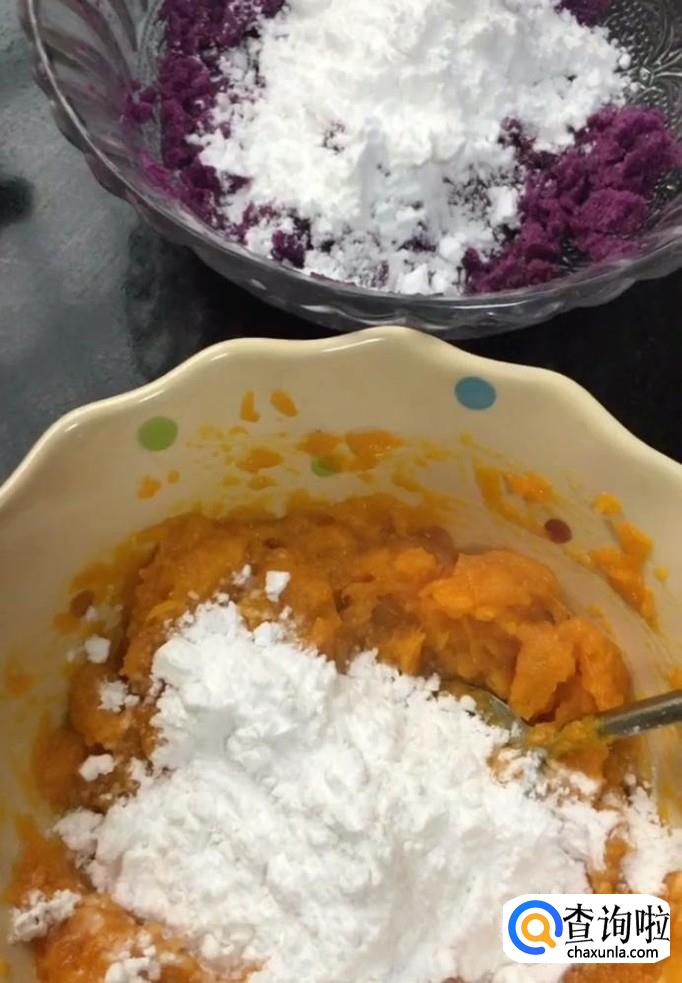 然后我们将蒸熟的紫薯南瓜分别放入两个碗中压成泥,放入适量的白糖,糯米粉