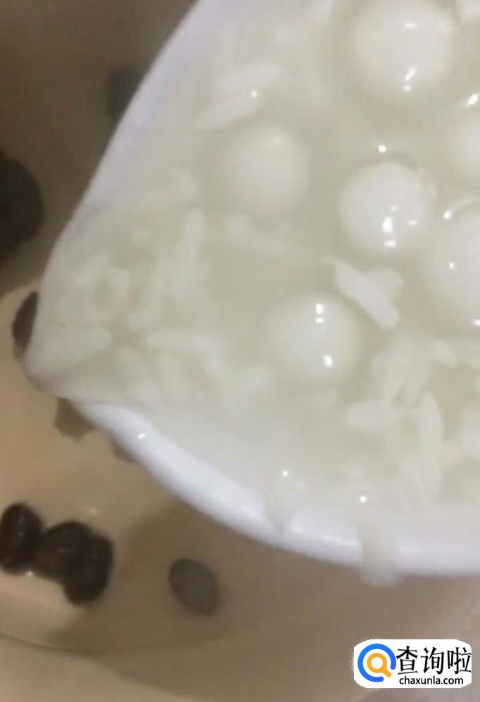 然后我们在一个碗中加入适量的蜜豆,倒入酒酿圆子,再倒入煮好的汤圆