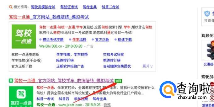 点“搜索”后,接着就会出现如下的页面,在页面上寻找驾校一点通模拟考试官网,然后用鼠标点击打开官网链接。