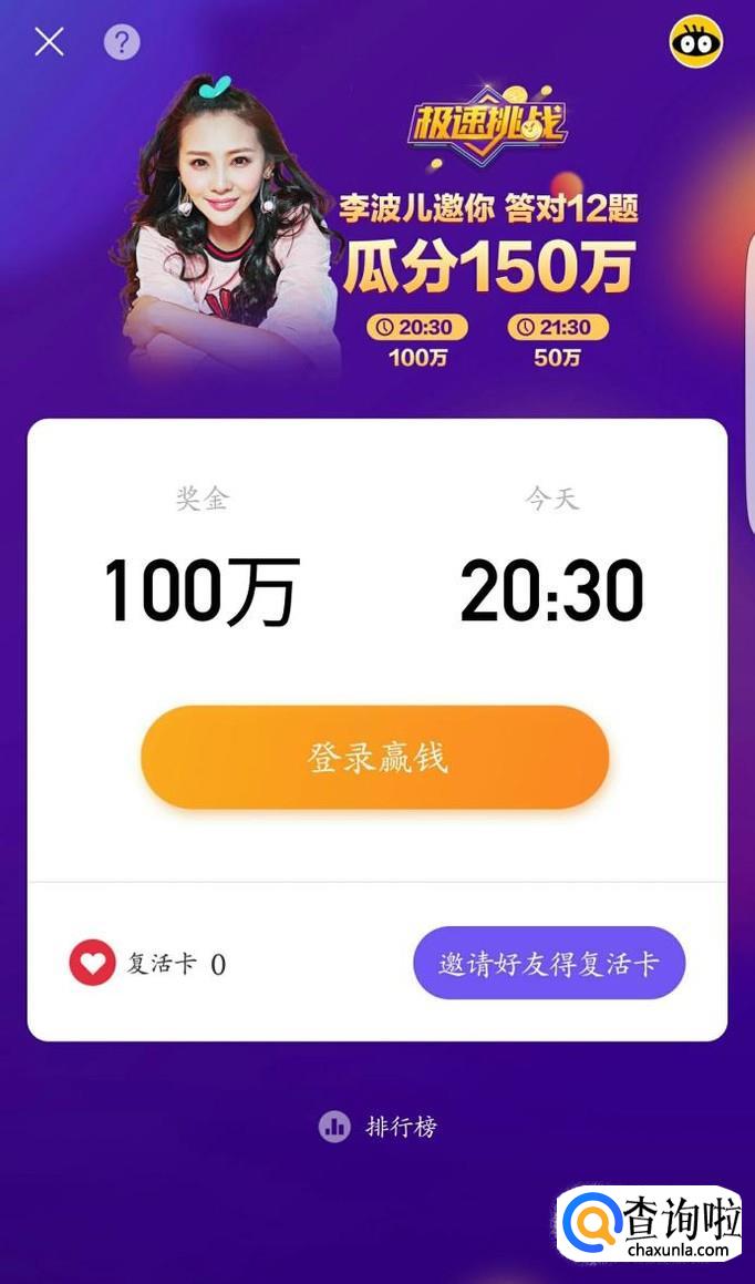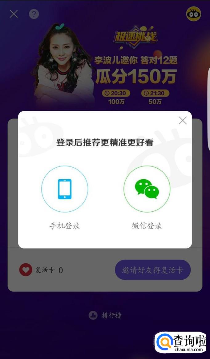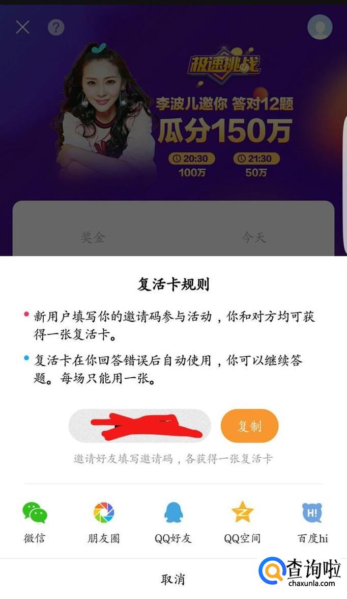 登录成功后可以点击点右下角的获得复活卡,其实你需要将几个邀请分享到朋友圈、微信、qq好友、qq空间的即可获得答题复活卡。