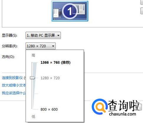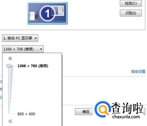 点击分辨率右边的下拉箭头,把分辨率拖到1366x768,再点下面的“应用”或“确定”。