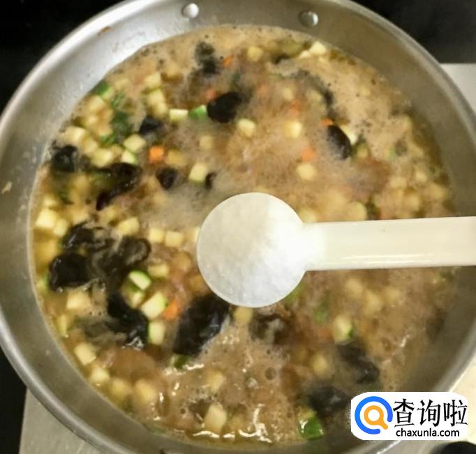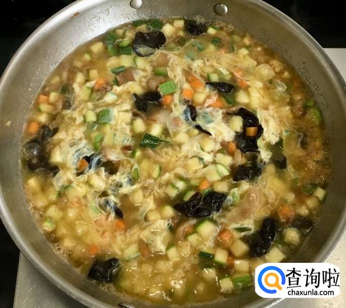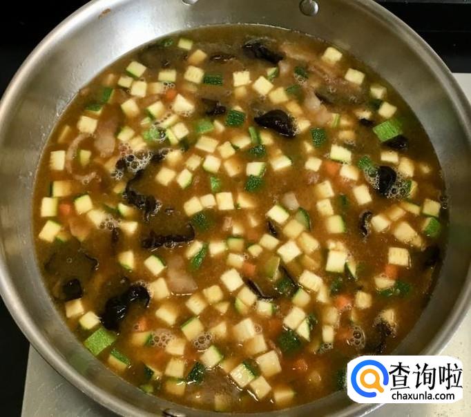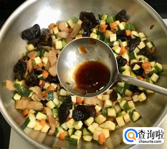 倒入角瓜丁、胡萝卜丁、木耳块翻炒均匀,加入适量的蚝油和清水