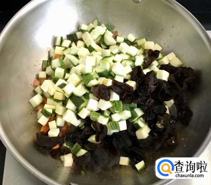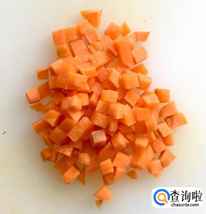 角瓜两根清洗干净切掉两端后切成小丁,胡萝卜半根清洗干净削去外皮切成小丁备用