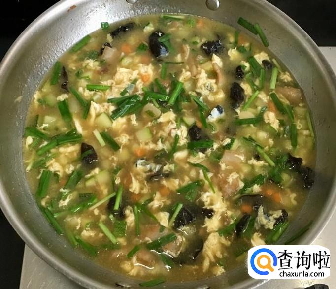 煮沸后加入适量的盐调味儿,均匀的淋入鸡蛋液熟透后关火撒入韭菜段轻轻搅拌均匀即可