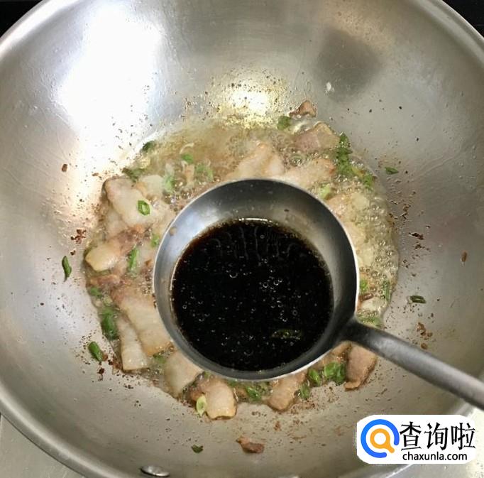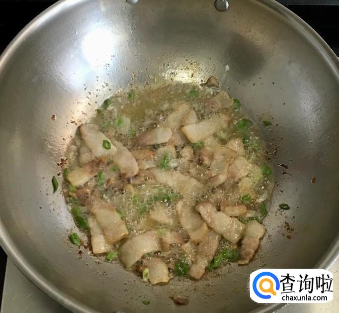 热锅加入适量的花生油把五花肉片炒香,放入葱花、蒜片爆香,料酒、生抽烹锅
