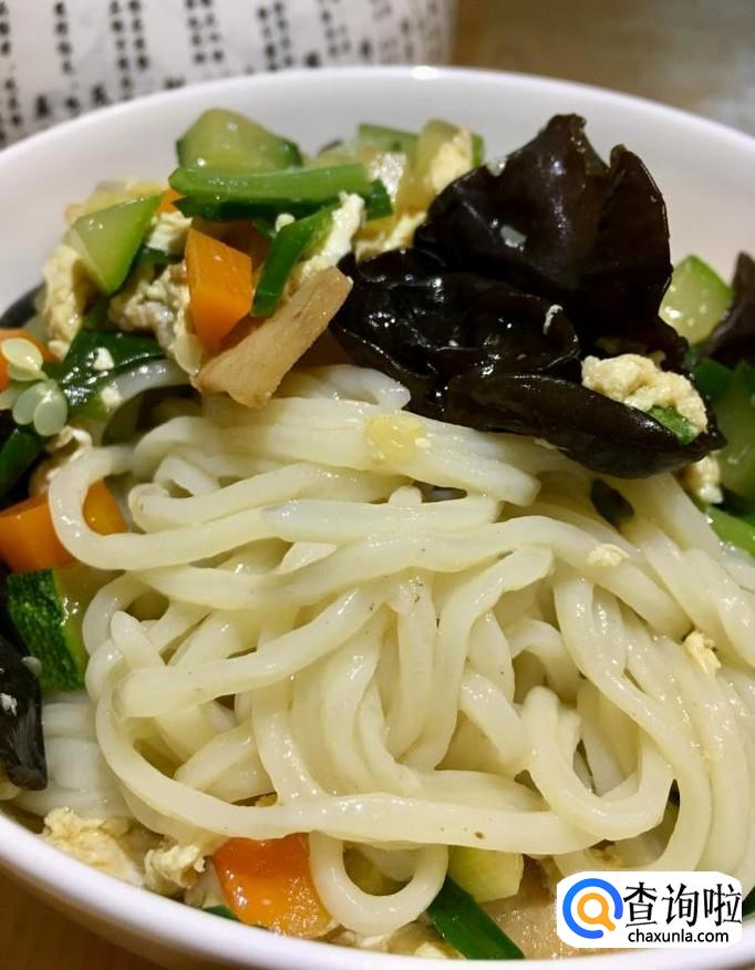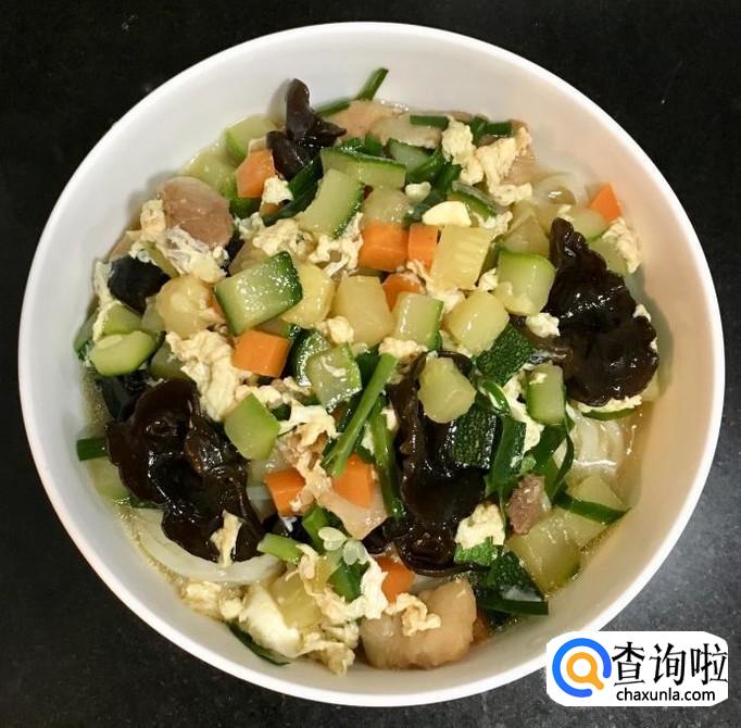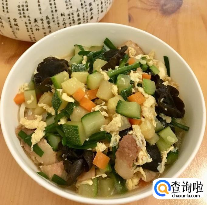 面条,角瓜,胡萝卜,水发木耳,五花肉,花生油,盐,水等等