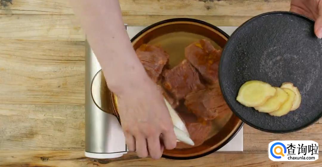 将腌制好的牛肉捞出,下入清水锅中,加入葱段,生姜片然后煮沸焯水,八成熟后捞出沥干。