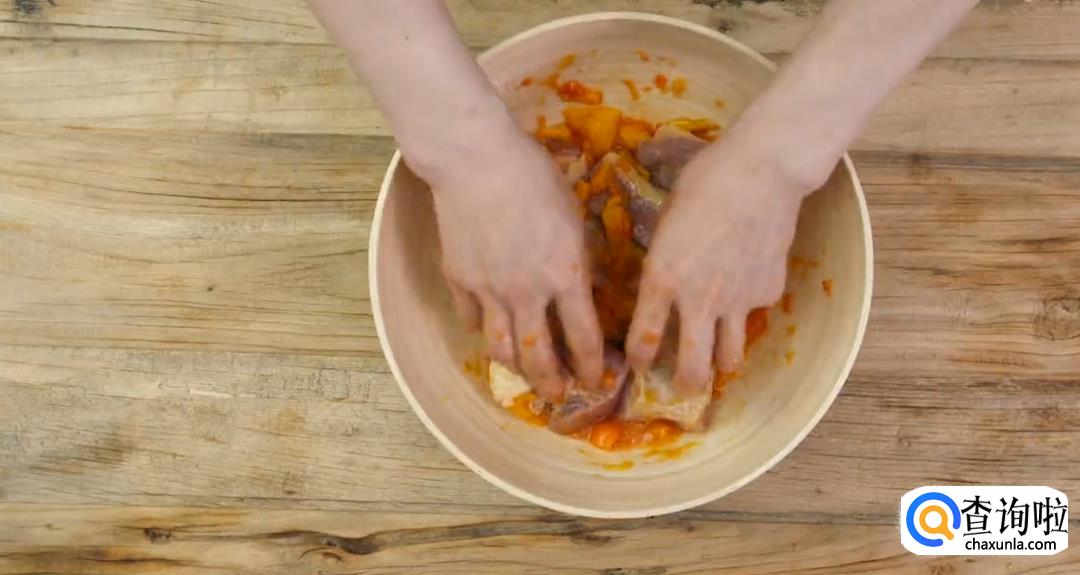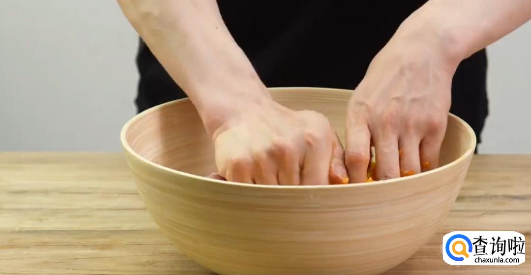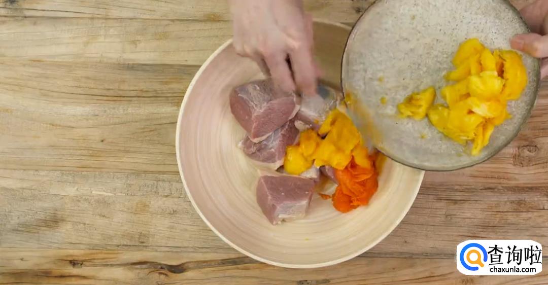 将果肉放入肉中,用手将果肉抓烂然后与肉搅拌均匀。