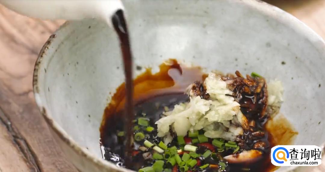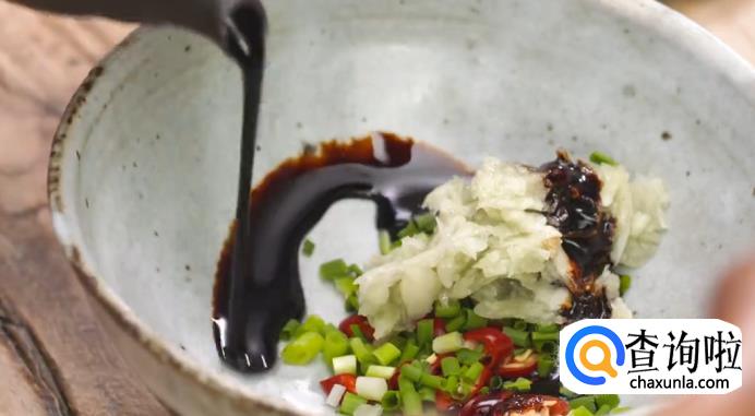 准备蘸水:将椒圈,葱末,蒜蓉倒入碗中,再加生抽和醋搅拌均匀。