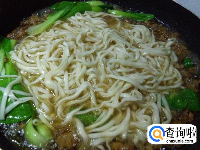 锅中的汤烧开后,将青菜放入锅中,倒入煮好的面条搅匀