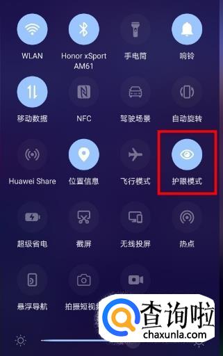 从手机屏幕顶端下拉,拉出所有功能图标,打开护眼模式的图标即可。