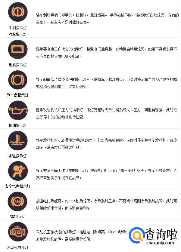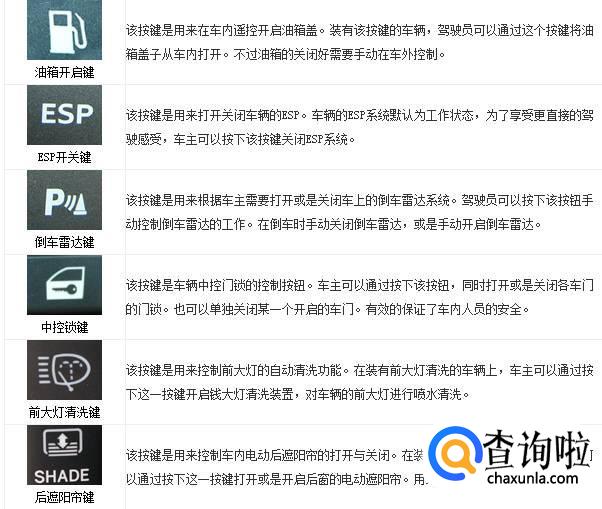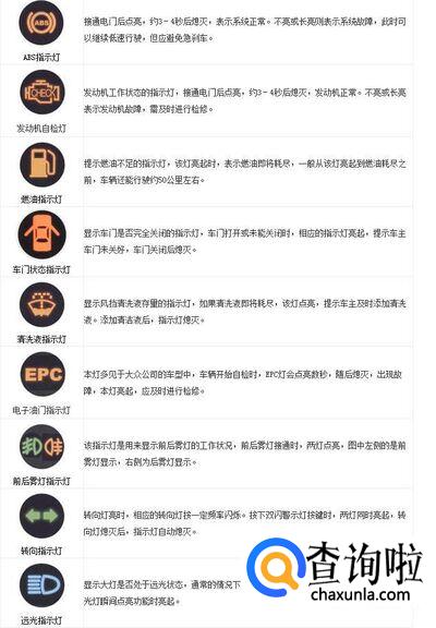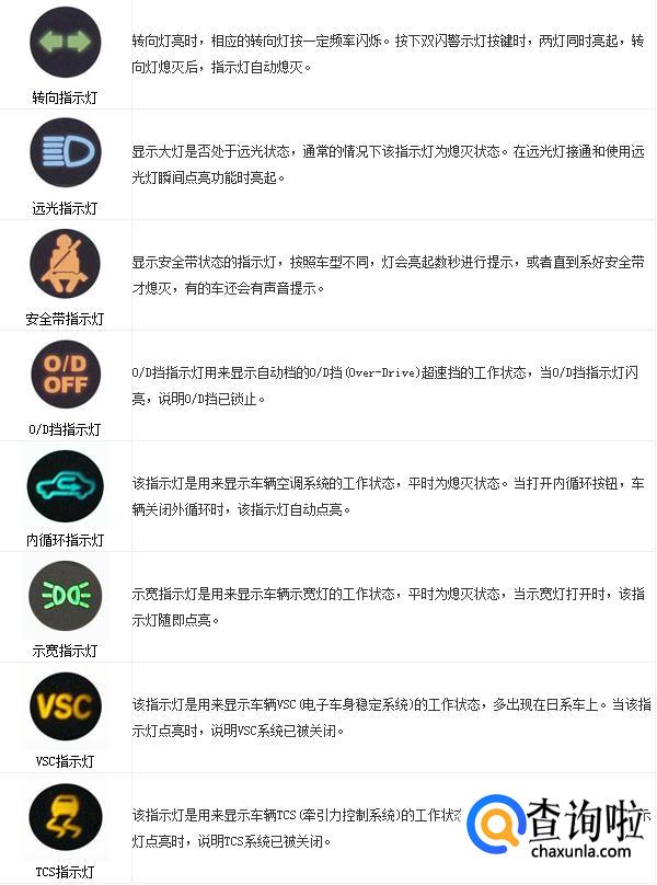 汽车仪表盘指示灯和车内功能按键图标及文字说明