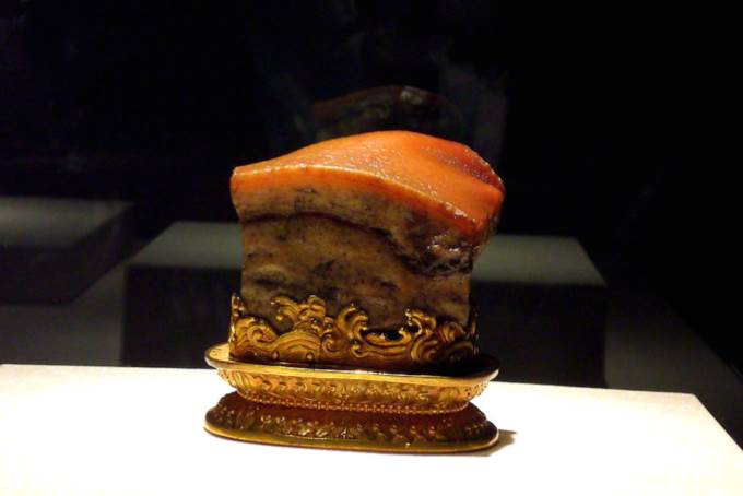 2、肉形石:肉石珍贵在有皮。世间红白相间的石头比较多,但要有皮有痩有肥才算肉石中的上品。上面的色彩纹理都是天然形成,工匠因势造型将表面染色,使其肉皮、肥肉、瘦肉层次分明,几乎已经到了以假乱真的程度。