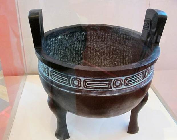 3、毛公鼎:西周晚期青铜器,因作器者毛公而得名。口饰重环纹一道,敞口,双立耳,三蹄足。毛公鼎乃是周宣王即位之初所制,周宣王亟思振兴朝政,遂恳请叔父毛公(姬歆)协助治理国家政务,毛公因而铸鼎传示子孙。