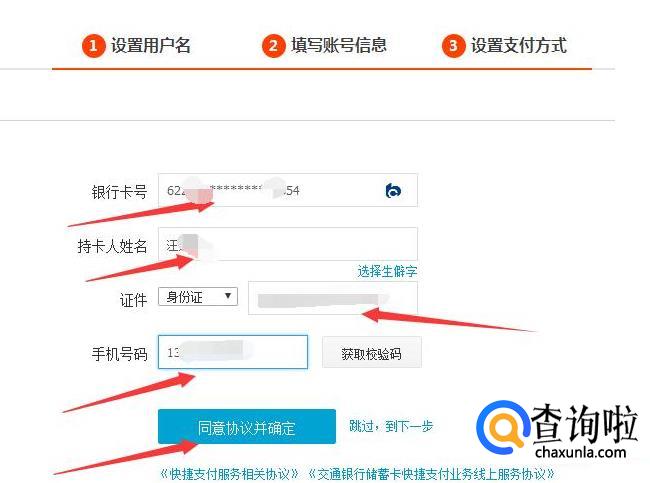 进入“设置支付方式”界面,填写银行卡号,姓名,身份证号,银行预留的手机号,然后点击“同意协议并确定”进入下一界面,如图。