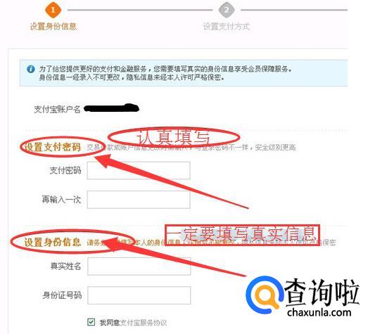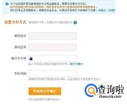 按照系统提示的要求填写完毕之后,点击“确定”按钮之后,进入支付方式设置页面, 根据提示的要求填写本人相关信息之后,点击“同意协议并确定”这个按钮。